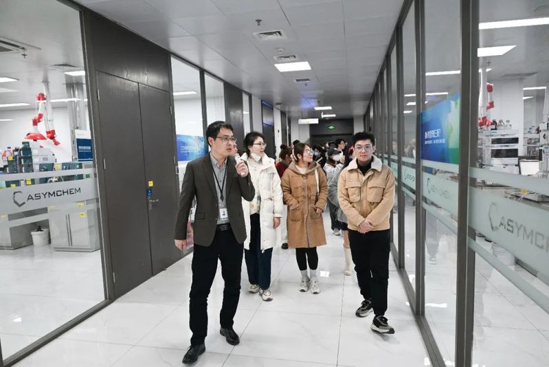 接着,学院师生受邀参观集团厂区,在负责人的带领和讲解下,依次经过了化学工程部实验室、DOE实验室、连续化学组实验室、QC实验室、核磁等大型实验室。让学生对在校习得的科研理论、实验室工程工艺如何从学校接轨到企业生产实践有了更为直观的了解。