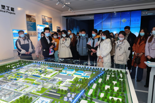 接着师生一行人抵达天辰公司总部,在人力资源部校招负责人姚瑶陪同下参观了天辰公司展室。中国天辰诞生于1953年,原为原化工第一设计院,是新中国首批成立的大型国家级专业设计院之一,被称为共和国化工设计行业的“长子”。随后,同学们观看了天辰公司的宣传片。当介绍产业链流程板块时,智能化感应互动模式吸引了多名同学前去尝试体验。在展厅中,同学们一路走、一路看、切身体会感受企业文化,在愉悦轻松的氛围中对中国天辰有了更深入的认识。