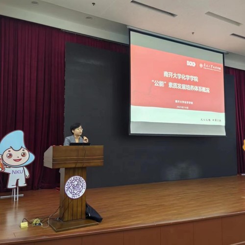 刁立达以对“公能”二字的解读入题:“公”即为德,“能”即为才,“公能”具体表现就是德才兼备。随后,刁立达老师从南开化学的课堂教学、校园文化、社会实践三位一体的“公能”素质发展培养体系展开介绍。从大一的保障适应、促进起步阶段到中高年级分层分类、精准施策,学院着力打造“三全育人”大格局,推行小班化教学、专业班导师制度,帮助学生扎实专业基础、了解学科前沿;注重思想引领,通过杨石先精神宣讲团、郭明义爱心分队、星光科普团等学生组织发扬爱国主义传统、传承化学先贤精神,借助社会实践、志愿服务等平台积极投身”知中国,服务中国“的青春实践;学院还组织开展”化有华彰“学生荣誉盛典、”“一二·九”爱国运动校园纪念跑、“三大球”系列体育赛事等品牌文体活动,打造五育融合、丰富多彩的校园“第二课堂”。刁立达老师还针对学生关注的奖助体系、毕业去向等方面进行了详细介绍,鼓励同学们把握青春时光、善用学习资源,更好地逐梦起航。