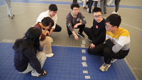 达芬奇密码项目考验团队成员的团结协作、思维灵活变换能力,面对杂乱无序的扑克牌,该如何快速按顺序翻开所有牌面,各支队伍奇思妙想、集思广益,各种巧妙方法层出不穷,“第一位同学先将13张牌排成一行、两行”,“每位同学在翻牌后按圆形顺序将其摆好”,“6位队员只记自己翻牌的数字和位置”……工作人员计时开始后,每组同学如同离弦之箭般疾驰而出,队员们默契配合,奋力拼搏,不断接力完成全部扑克牌的翻转,赛场上欢呼声此起彼伏、激昂澎湃。最终,无机第一党支部联合无机第二党支部组成的“好运莲莲队”和高分子所第六党支部组成的“高分子六支部队”以1分27秒的优异成绩并列第一。