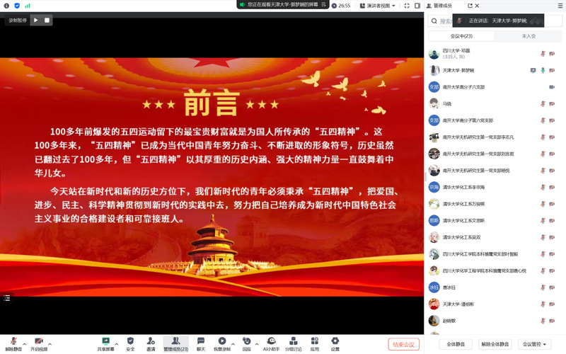 天津大学化工学院2023级硕士生生化第二党支部的郭梦娴作了题为《弘扬五四精神,争做有为青年》的报告,结合历史与现实,阐述了新时代青年如何继承和发扬五四精神。