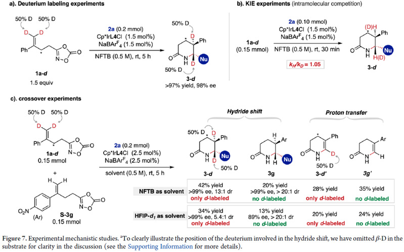 为了探究反应机理,作者首先进行了机理实验。如图7a所示,在标准条件下,目标产物3-d的收率>97%,ee值为99%。3-d的1H NMR谱证实了50%的氘原子在N-α-D和苄基位置,表明3的生成涉及1,2-负氢迁移。此外,动力学同位素实验 (KIE)(图 7b)表明 KIE ∼ 1.0,表明1,2-负氢迁移不是速率控制步骤。交叉实验(图 7c)表明,无论是NFTB还是HFIP-d1作溶剂,氘的引入仅发生在3-d中,而3g保持未氘化状态。该实验说明1,2-负氢迁移是一个分子内过程。同样,对于生成烯酰胺副产物的质子转移途径,只有3-d' 引入氘,而 3g' 保持未氘化状态。这些结果表明质子转移也是一个分子内过程,并且是不可逆的。
