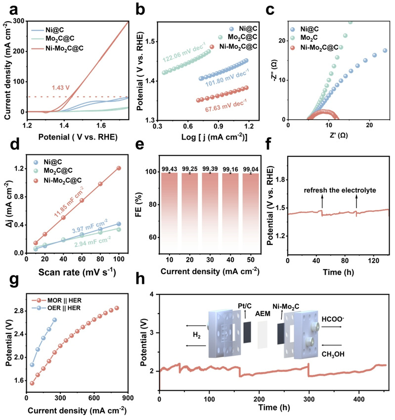 电化学测试结果表明,Ni-Mo2C@C在MOR氧化反应(MOR)中展现出卓越的活性和优异的稳定性。Tafel斜率、电化学双层电容(Cdl)、电化学阻抗谱(EIS)测试均表明,形成异质结后电化学活性表面积显著增加,电荷转移电阻降低,从而提升了催化活性。通过计时电位法在 10–50 mA cm-2电流密度下测得的甲酸盐产物法拉第效率(FE)接近 100%,表明其具有很高的选择性。Ni–Mo2C@C 在组装流动池测试中仅需 1.93 V 即可达到 200 mA cm-2,比传统 OER 降低22.2%,且长达 450 小时保持高稳定性。