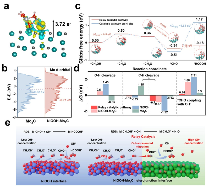 差分电荷密度以及d带中心计算表明形成异质结后有利于Mo2C聚集吸附OH⁻。反应吉布斯自由能图揭示了,接力催化路径大大降低了最后一步耦合反应的热力学能垒(1.68 eV → 0.16 eV),决速步因此变成甲醇的O-H键断裂反应,与KIE结果一致。