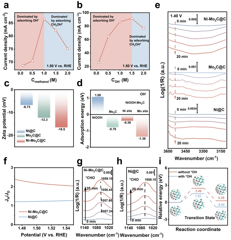 2. 原位 ATR-FTIR 光谱与理论模拟相互印证,表明 NiOOH–Mo2C@C 异质结通过甲醇与OH⁻的差异化吸附能,有效调控两种反应物在电化学界面的分布。