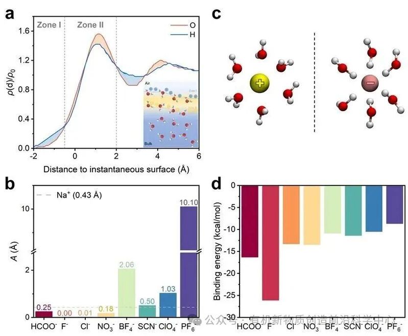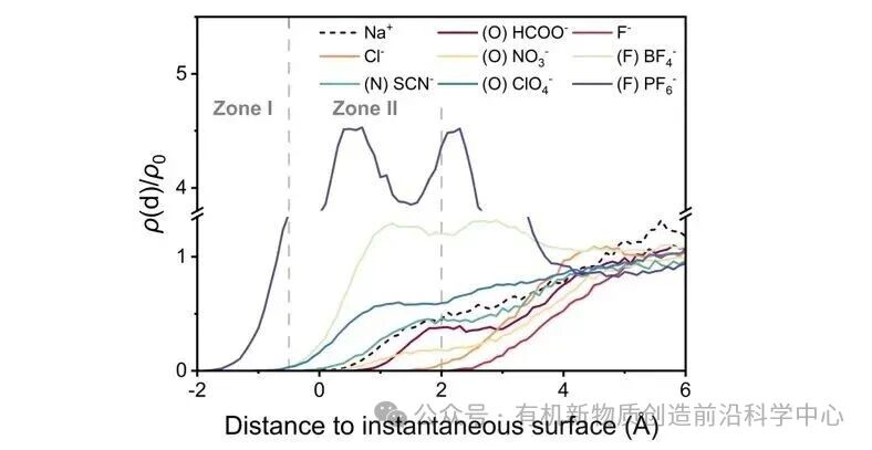 为了探究这一现象背后的微观机制,作者利用MD模拟分析了界面水的结构与离子分布。结果表明,微液滴气-液界面由于水分子有序排列而呈现明显的电荷分离结构:外层界面区(Zone I)氢原子富集,显正电性;内层界面区(Zone II)氧原子富集,显负电性,这种结构是表面电场产生的基础(图3a)。进一步分析不同离子的分布表明,其界面亲和性顺序与Hofmeister序列大体一致,抑制反应的阴离子(BF4-、SCN-、ClO4-、PF6-)更倾向于富集在界面,而HCOO-、F-、Cl-、NO3-的界面亲和性则弱得多(图3b和图4)。作者认为,离子水合结构的差异直接影响其调控电场的能力:阳离子通过吸引水分子中的氧原子,促使氢原子朝外排列,从而增强表面电场;阴离子则吸引氢原子,降低外层氢原子密度,从而削弱电场(图3c)。因此,表面电场的增强或削弱是阴阳离子共同作用的结果。