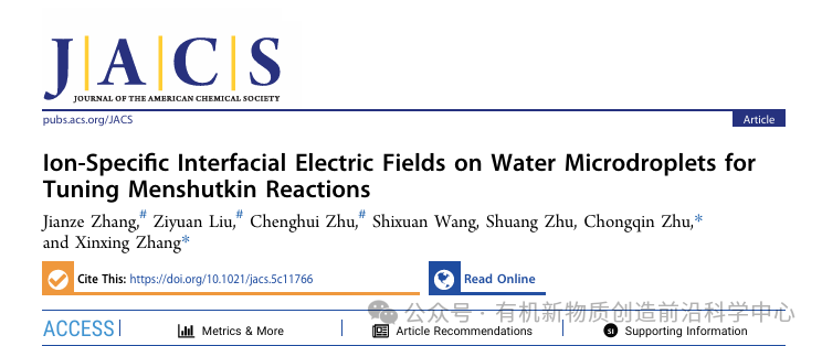 Ion-Specific Interfacial Electric Fields on Water Microdroplets for Tuning Menshutkin Reactions, Jianze Zhang, Ziyuan Liu, Chenghui Zhu, Shixuan Wang, Shuang Zhu, Chongqin Zhu*, Xinxing Zhang*, J. Am. Chem. Soc., 2025, DOI: 10.1021/jacs.5c11766