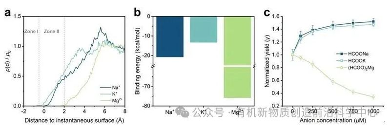 作者还考察了阳离子的影响。结果表明,Na+与K+的界面富集程度相近,对反应的加速效果也类似;而高电荷密度但界面惰性的Mg2+则几乎只在体相分布,导致表面电场被阴离子削弱、反应速率显著下降(图5)。该结果进一步证实了先前的结论。