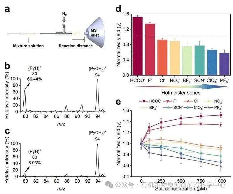 Menshutkin反应是一类典型的SN2反应,在体相中反应速率较慢;而在微液滴中,由于表面电场的作用,其反应速率可提高数个数量级,这在张新星教授团队之前的工作中已被证实(J. Am. Chem. Soc. 2023, 145, 26003)。在此基础上,作者首先验证了电场对该反应的催化作用(图1),并证明Py和CH3I倾向于在界面富集。随后,作者在含有500 μM Py和CH3I的水溶液中分别添加不同单价阴离子的钠盐(HCOO-、F-、Cl-、NO3-、BF4-、SCN-、ClO4-、PF6-)并雾化为微液滴(图2a)。在相同反应时间下,通过质谱检测产物信号,并以产物 (PyCH3)+的信号强度和产物与反应物 (PyH)+的信号强度和的比值作为反应产率。与无盐体系(产率约60%)相比,加入1000 μM HCOONa可将产率提高至91.8%,说明HCOONa对反应具有明显加速作用(图2b-c)。系统比较各含盐体系的归一化产率发现,反应速率随阴离子种类变化呈现出与Hofmeister序列高度一致的趋势(图2d-e):HCOO->F->Cl->NO3->BF4- ≈ SCN-> ClO4-> PF6-。该趋势在不同盐浓度下保持稳定,表明离子特异性效应对反应速率的影响具有普遍性。