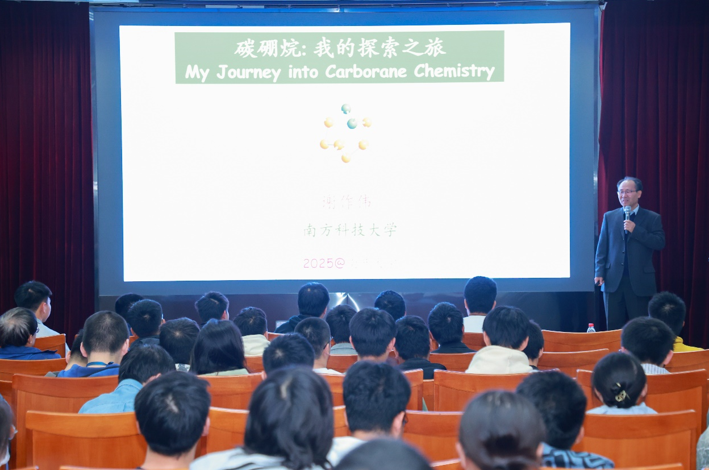 讲座伊始,谢作伟院士以碳、硼两种元素为切入点,系统梳理了二者在化学领域的重要地位——硼元素性质独特,曾助力多位化学家斩获诺贝尔奖,而其自身与碳元素的差异性更为碳硼烷化学的创新发展提供了丰富可能。从平面苯环的研究演进到立体碳硼烷的开发突破,谢作伟院士回顾了该领域的学术发展脉络,着重分享了自己深耕碳硼烷化学三十年的研究历程与心得体会,展现了其为学科发展所作出的卓越贡献。