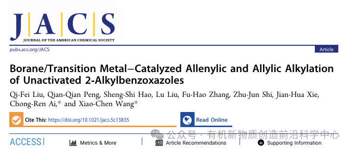 Borane/Transition Metal–Catalyzed Allenylic and Allylic Alkylation of Unactivated 2-Alkylbenzoxazoles, Qi-Fei Liu, Qian-Qian Peng, Sheng-Shi Hao, Lu Liu, Fu-Hao Zhang, Zhu-Jun Shi, Jian-Hua Xie, Chong-Ren Ai*, Xiao-Chen Wang*, J. Am. Chem. Soc. 2025, DOI: 10.1021/jacs.5c13835