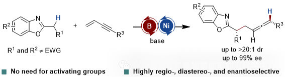 图1. 硼/镍协同催化非活化2-烷基苯并噁唑的不对称联烯丙基化反应