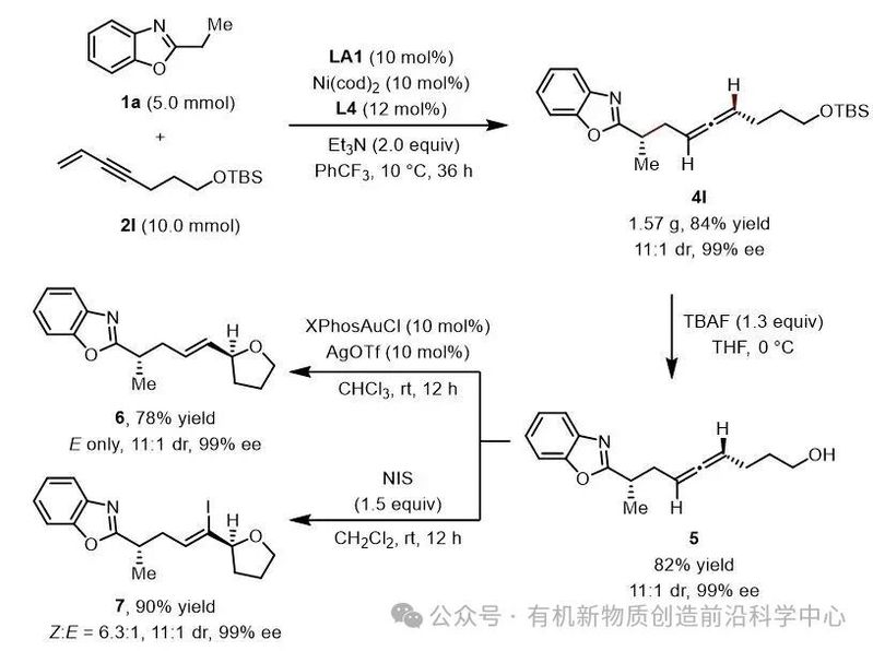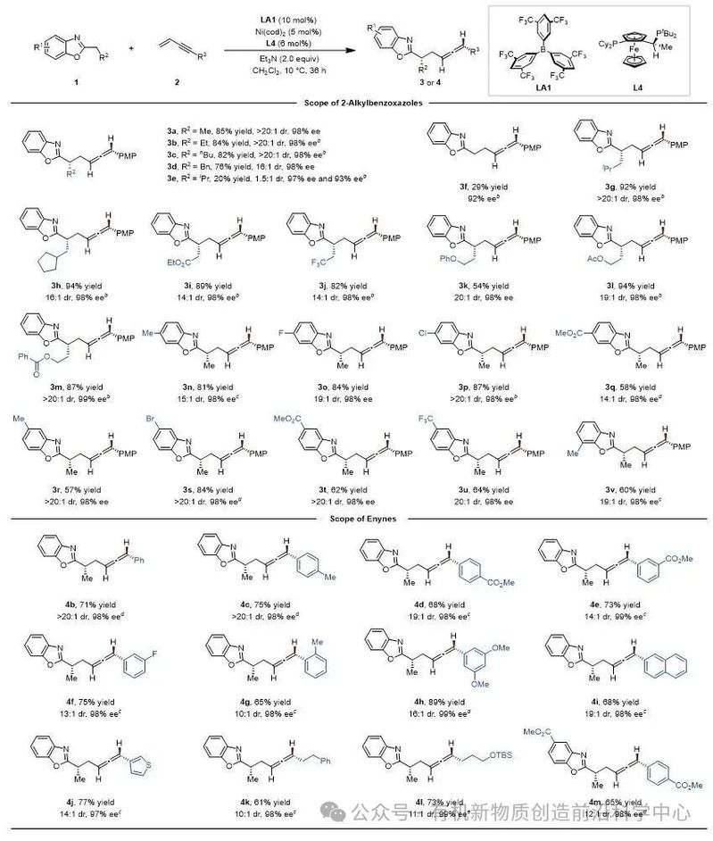 通过条件优化,确定以B[3,5-(CF3)2C6H3]3(LA1)作为路易斯酸催化剂,与由Ni(cod)2和手性Josiphos配体SL-J009-1原位生成的镍催化剂协同作用,实现高立体选择性转化。该反应展现出优异的底物普适性:无论是2-位带有不同烷基链或苯环含多种取代基的苯并噁唑,还是芳基、杂芳基及烷基取代的共轭烯炔,均能有效兼容,以较高收率和高立体选择性获得相应目标产物(图2)。