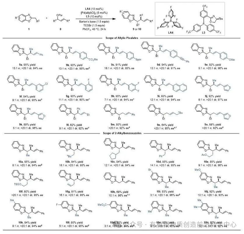 在此基础上,该课题组进一步将“硼–过渡金属”协同催化策略拓展至未活化氮杂芳烃的不对称烯丙基化反应。之前,该类反应中构建含两个相邻手性中心的产物报道很少,且局限于环状烯丙酯底物。研究发现通过合理调控硼催化剂结构,以B[3,4,6-F3C6H2]3(LA4)作为催化剂,并以[Pd(allyl)Cl]2与PHOX型配体原位生成的钯物种作为金属催化剂,成功实现了2-烷基苯并噁唑与链状1,3-二取代烯丙酯的不对称偶联反应。该催化体系底物适用范围广泛(图5)。