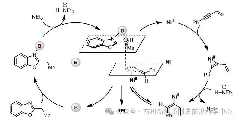 基于相关文献报道,作者提出了可能的反应机理(图4):在硼催化循环中,硼催化剂通过配位增强苯并噁唑 α 位质子酸性,随后在碱的作用下发生去质子化,形成高活性亲核中间体。在镍催化循环中,零价镍首先与炔烃发生氧化加成,生成镍(II)-烯烃三元环中间体;该中间体被碱所形成的共轭酸质子化,进而生成关键的 π-联烯丙基镍亲电中间体。最终,亲核中间体与亲电中间体发生偶联反应得到目标产物,同时实现硼催化剂与镍催化剂的再生。