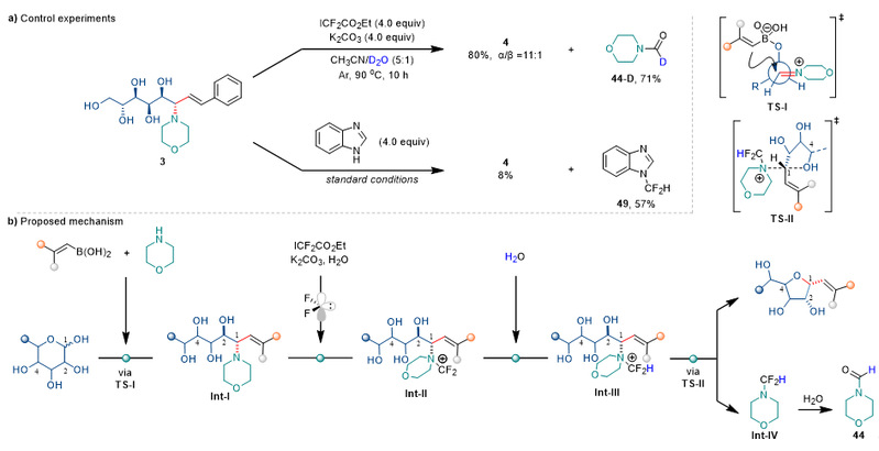 控制实验(图3a)为反应机理提供了关键证据:1)D2O的使用显示主产物未被氘代,副产物(44-D)源自中间体水解;2)二氟卡宾捕获实验显著抑制环化,分离产物49证明了二氟卡宾的参与。基于以上结果和先前的报道,作者提出了可能的机理:1)开环与C–C键形成:吗啉与醛糖生成亚胺中间体,经TS-I实现乙烯基迁移;2)C–N键活化:二氟卡宾与吗啉单元依次形成叶立德Int-II与季铵盐Int-III,活化烯丙基C–N键;3)SN2关环:C4羟基进行分子内SN2环化,得到异头碳构型翻转的1,2-顺式呋喃碳-糖苷产物(图3b)。