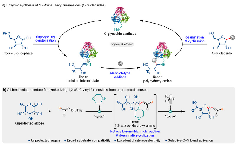自然界生物体内“分子机器”的精准合成,为化学家开发新型合成策略提供了关键灵感。受酶促碳-核苷生物合成启发(图1a),何刚教授团队开发了一种仿生“开-关”策略,具体而言:以吗啉模拟碳-糖苷合酶中赖氨酸残基的角色,与醛糖形成线性亚胺中间体,随后与烯基硼酸发生Petasis反应,高选择性生成1,2-反式线性多羟基胺;紧接着,利用高亲电性二氟卡宾选择性激活C–N键,促进分子内SN2取代,由C4羟基进攻异头碳,通过“开环-关环”过程高效构建1,2-顺式呋喃碳-糖苷(图1b)。