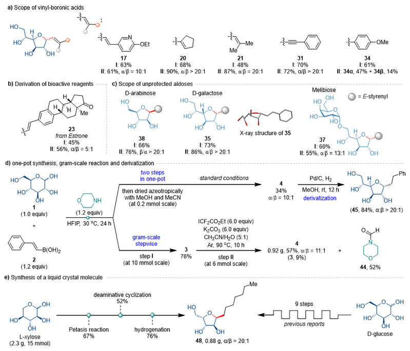 该方法展现出优异的底物普适性。多种芳基或杂芳基乙烯基硼酸、直链、环状和多烷基取代的烯基硼酸,以及炔基硼试剂和芳基硼酸均可兼容,以良好的产率和良好至优异的非对映选择性得到目标产物(图2a)。此外,该方法也适用于雌酮等天然产物和药物分子的糖基化(图2b),并对多种天然单糖和二糖同样表现出广泛兼容性(图2c)。