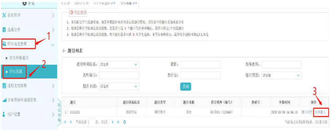如下图点击菜单栏左侧的“师生双选管理”后再点击“学生选题"'