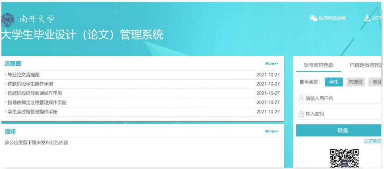 账号类型选择“学生”,输入用户名和密码(学生的用户名:学号,初始密码:学号@nk,登录后请先修改密码),登入后绑定自己的手机号、获取验证码、输入后即可。